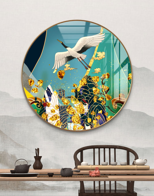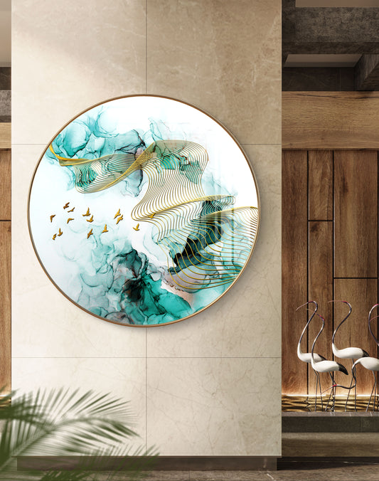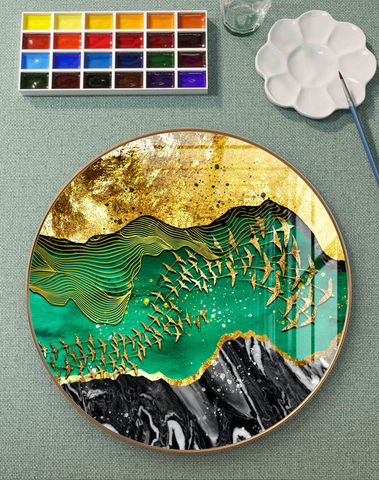 Round golden birds flying in green waves crystal resin