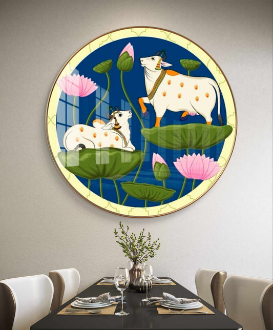 Round resin crystal cow pichwai painting