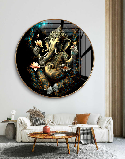 Round golden ganpati in black background crystal resin