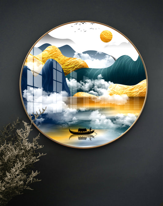 Round yellow & blue mountains landscape crystal resin