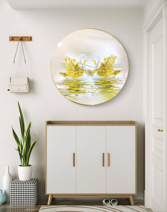 Round Golden and White Swan Crystal Raisin Art Golden Sleek Frame