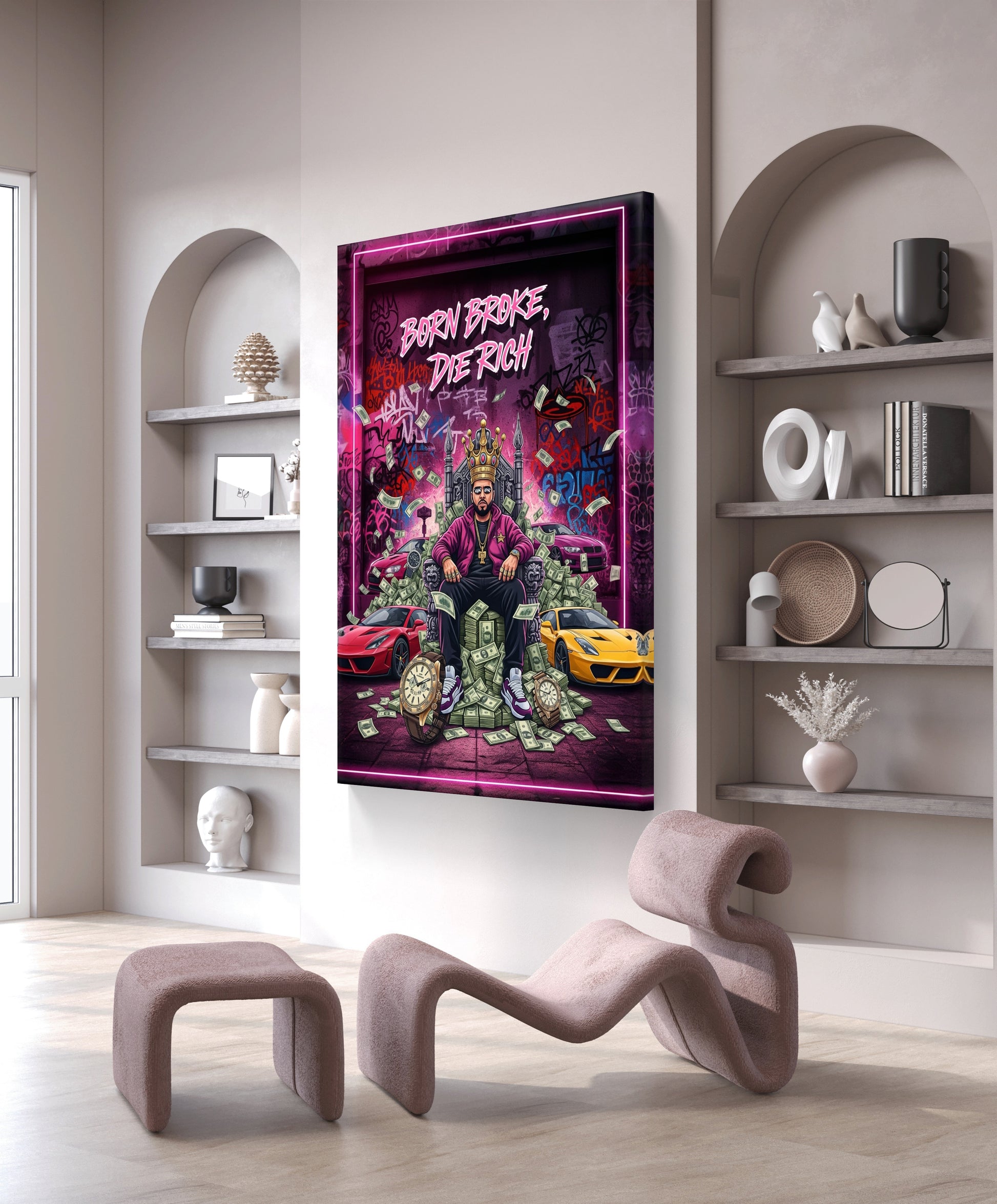 Embrace the ultimate rags-to-riches narrative with this bold canvas painting that celebrates ambition and transformation. Featuring the iconic phrase "Born Broke, Die Rich," this striking artwork serves as a daily reminder that your circumstances don't define your destiny. Perfect for entrepreneurs, dreamers, and go-getters who refuse to accept limitations, this piece combines motivational messaging with contemporary art aesthetics. Ideal for home offices, studios, or any space that needs an injection of hustle-fueled inspiration. A conversation starter that speaks volumes about your mindset and aspirations.