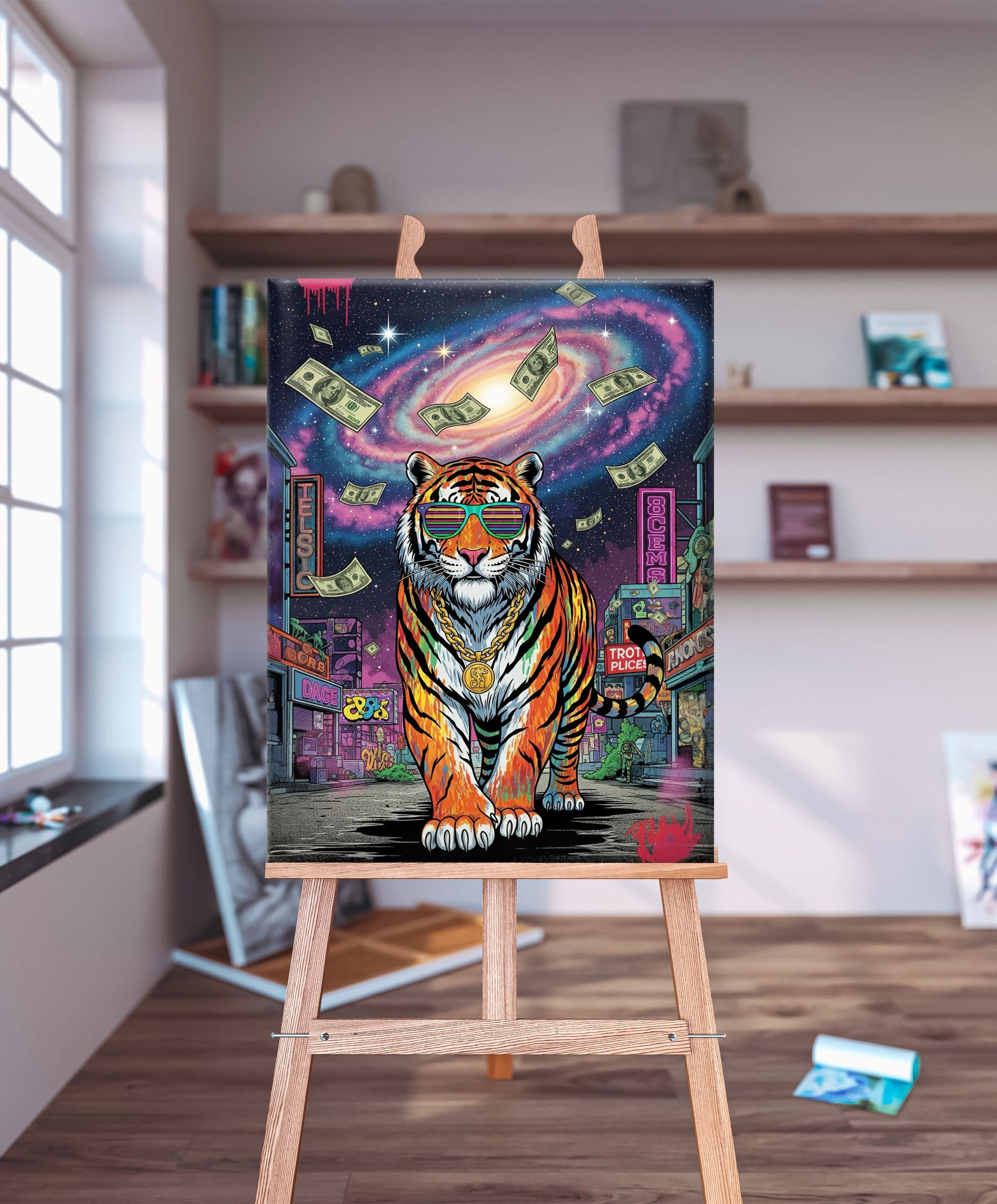 Meet the ultimate statement piece for those who dare to dream big. Our Galactic Hustler Tiger canvas painting captures pure swagger—a magnificent tiger sporting rainbow shades and a gleaming gold chain, striding through a neon-soaked metropolis with unshakeable confidence. Dollar bills sw