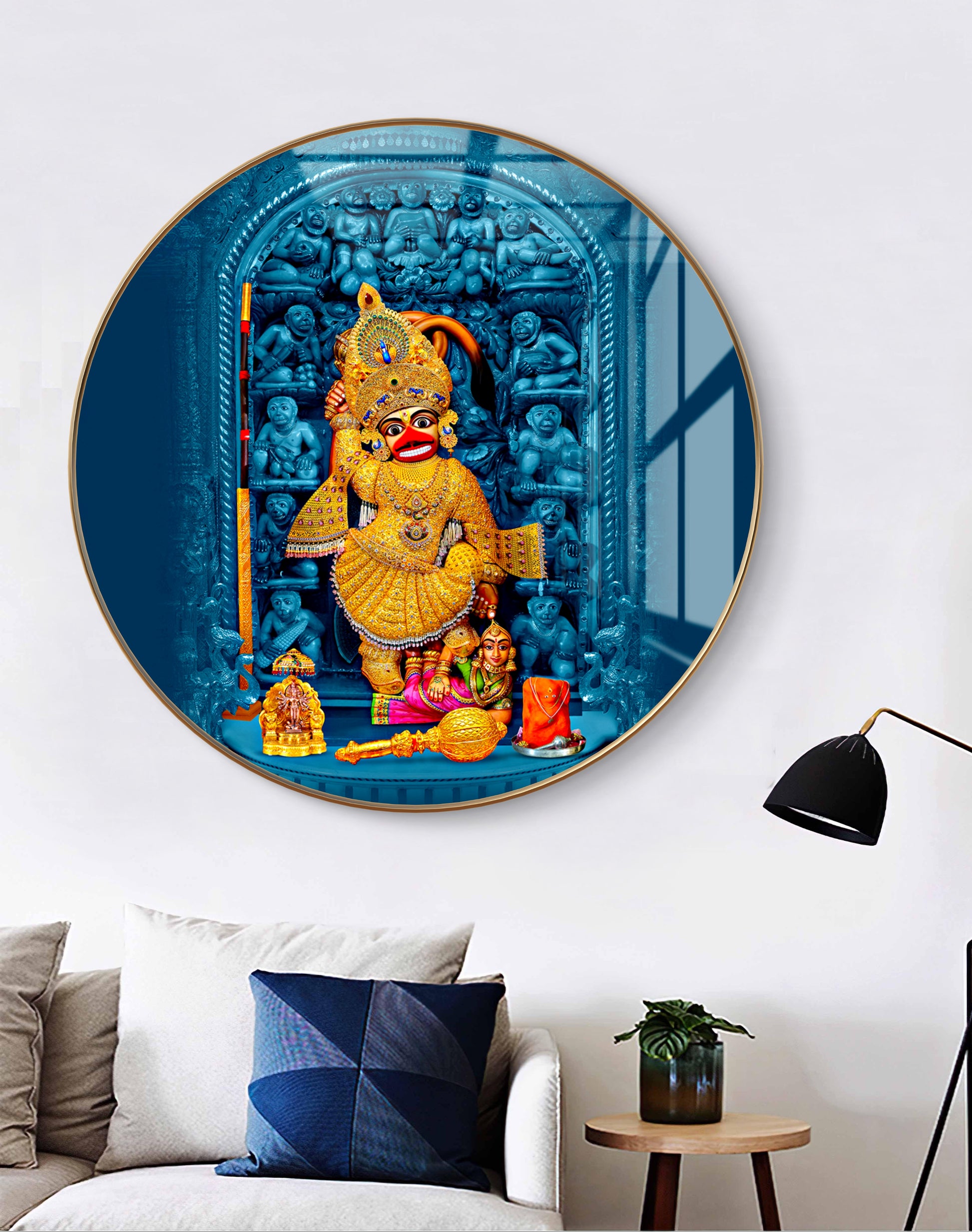 Showcase your devotion and add a touch of elegance to your home with this exquisite Round Sarangpur Hanuman Idol. The 3D statue is crafted from high-quality gold crystal resin, showcasing intricate details and a glossy finish. Bring blessings and beauty together with this one-of-a-kind piece.