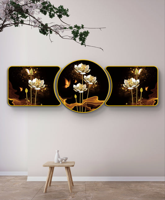 “Golden Lotus Symphony Majestic Golden Deer with Trees & Waves Framed Crystal Glass Framed Wall Paintings For Wall Decoration at Home & Wall Decoration items - Set of 3