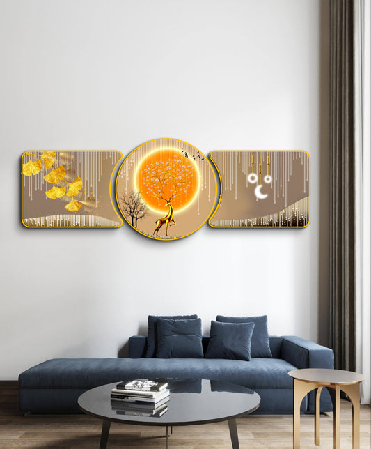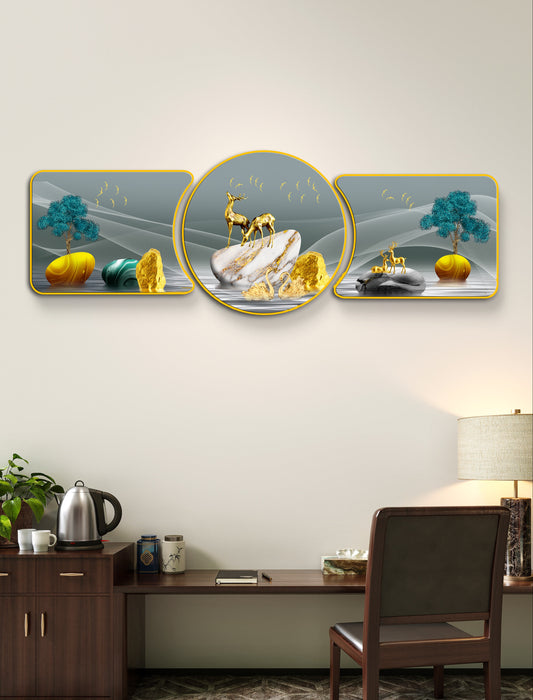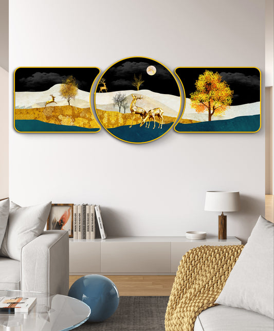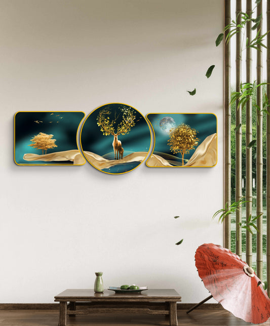 Majestic Golden Deer with Trees & Waves Framed Glass Crystal Painting Framed Wall Paintings For Wall Decoration at Home & Wall Decoration items - Set of 3
