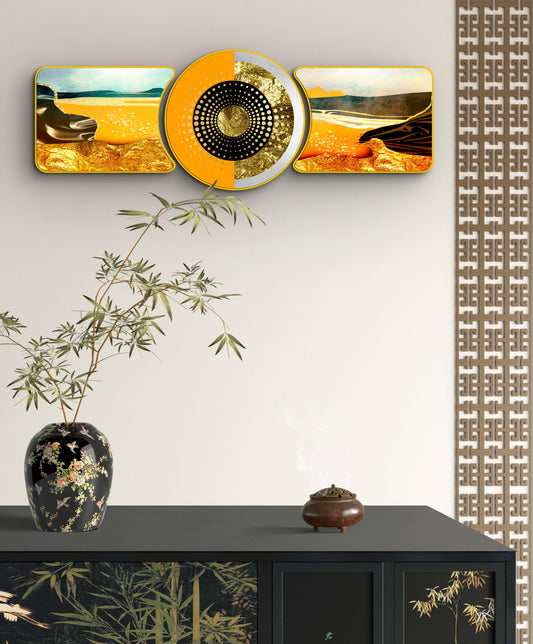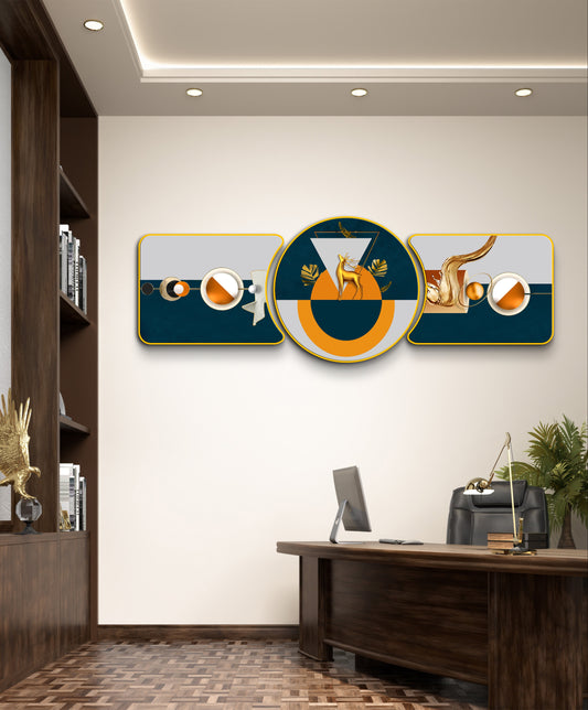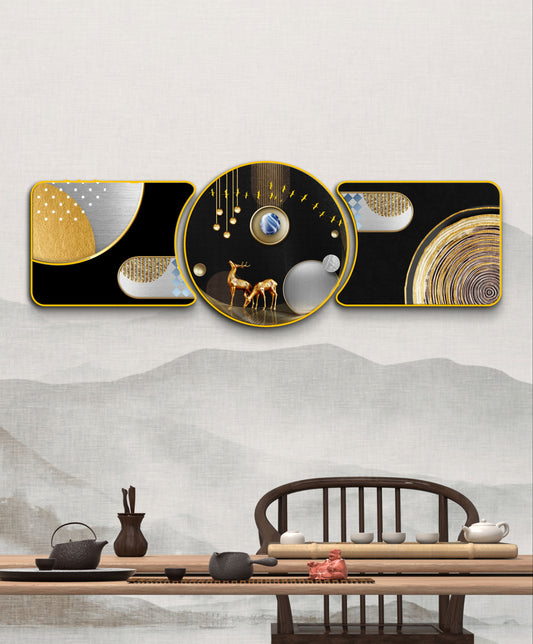 “Abstract Golden Rings with Deer – Majestic Golden Deer with Trees & Waves Framed Crystal Glass Framed Wall Paintings For Wall Decoration at Home & Wall Decoration items - Crystal Wall Art (Set of 3)”