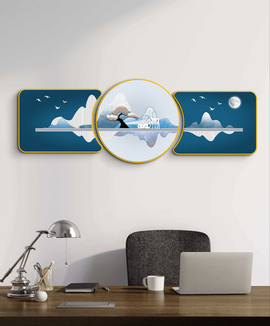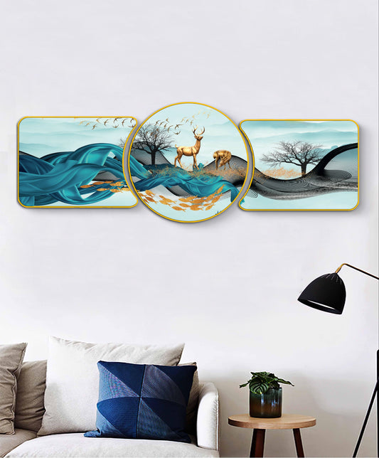 Blue Mountains Golden Deer Majestic Golden Deer with Trees & Waves Framed Crystal Glass Framed Wall Paintings For Wall Decoration at Home & Wall Decoration items - Set of 3