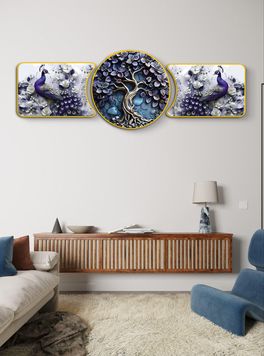 “Blue Tree & White Peacock Majestic Golden Deer with Trees & Waves Framed Crystal Glass Framed Wall Paintings For Wall Decoration at Home & Wall Decoration items - Set of 3